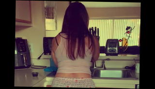 Unveiling Creampie, Pee & Milk Enema - LadyboyGold: tall and sexy Ladyboy Swan is sitting on the bed wearing a pink multi-colored blouse, red panties, and flat white sneakers. She stands up, turns around, and lifts up her blouse showing her ass to the POV.